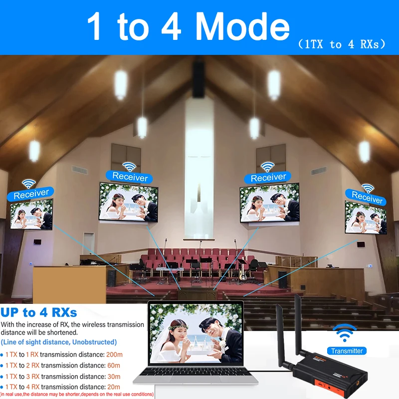 2. 200m Wireless long distance,can go through wall and IR Remote in one TX to one RX mode